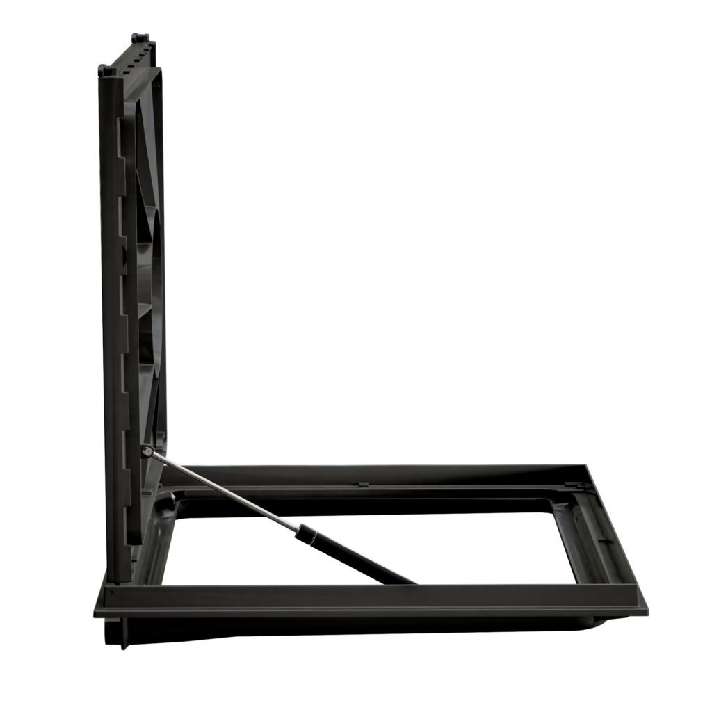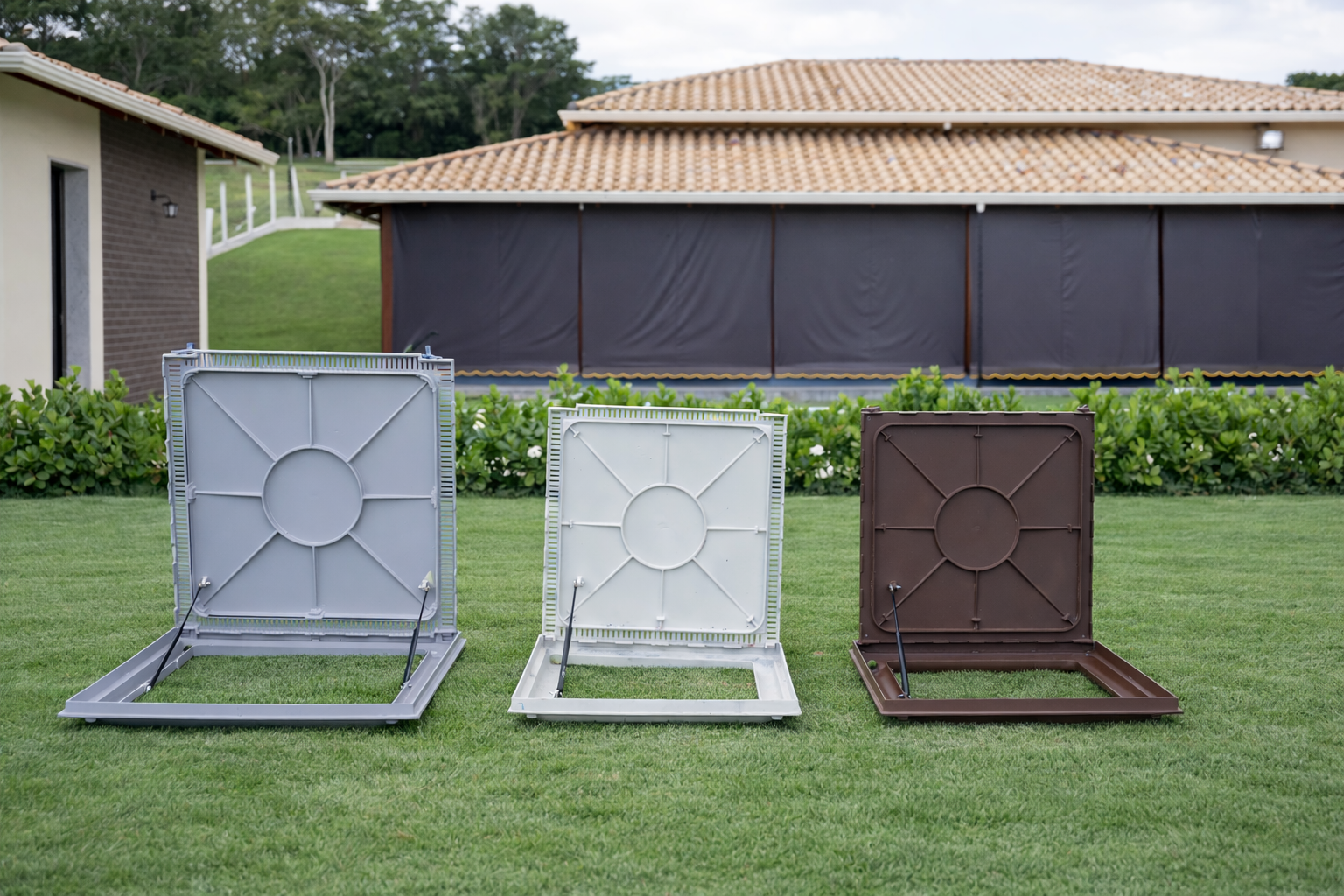 O que faz a tampa da Fundimais se destacar: pistão de segurança, pintura eletrostática e drenagem eficiente